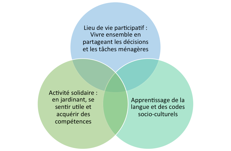 Nous innovons par la combinaison unique d’un lieu de vie participatif, d’un apprentissage intensif du français et d’une activité économique solidaire.